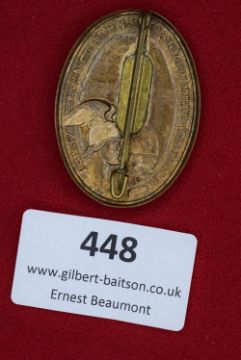 Oval bronze-finish badge of the German Gymnastics Federation, depicting muscular arm with staff, sun and oak leaves in background. Obverse inscribed “Deutscher Turnerbund 1936.”A 1926 2. Bundesschiessen Wien Badge, oval bronze example, depicting a classical figure of a marksman with rifle and oak leaves, inscribed 2. Bundesschiessen Wien 1926. Pin-back fixing to reverse.