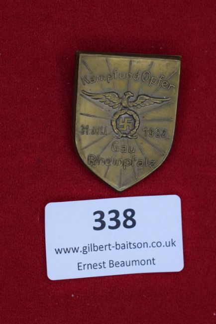 Shield-shaped badge in bronze, inscribed Kampf und Opfer, Gau Rheinpfalz, 31. Juli 1932. Features eagle with swastika in wreath.