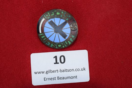 Enamel badge issued by the Reichsluftschutzbund (RLB)—the Reich Air Protection League—responsible for organizing civilian air raid precautions (ARP) and defense measures throughout Nazi Germany. This variant is known for its vibrant enamel and distinctive wheel-and-lightning motif. Maker-marked with GES. GESCH.