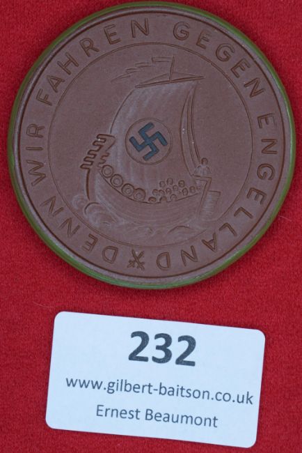 A circular celluloid propaganda medallion, approx. 90mm diameter, depicting a Viking ship with swastika sail and inscription “Denn wir fahren gegen Engeland“ (“For we sail against England”). Reverse with eagle motif, swastika, and legend “Feldzug in Holland und Belgien – 10. Mai 1940“