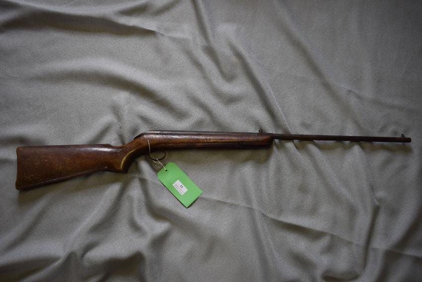 .177 calibre break barrel air rifle with wooden stock and iron sights. This example shows considerable age and use, with notable wear to the stock and bluing, giving it a rustic patina. A simple and robust single-shot air rifle design, representative of classic sporting arms of its era. Condition well-worn, stock and barrel with age-related marks, sold for spares/restoration