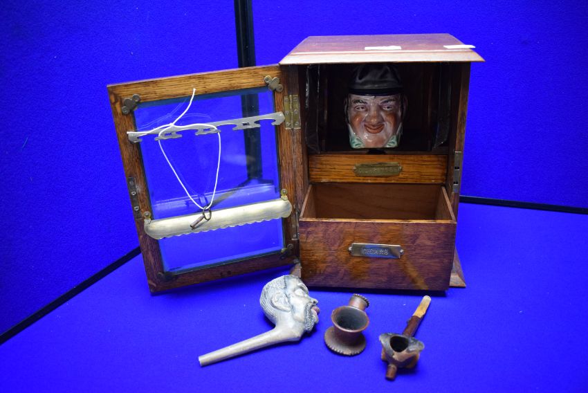 Edwardian Oak Smokers Cabinet with Pipes and Tobacco Jar