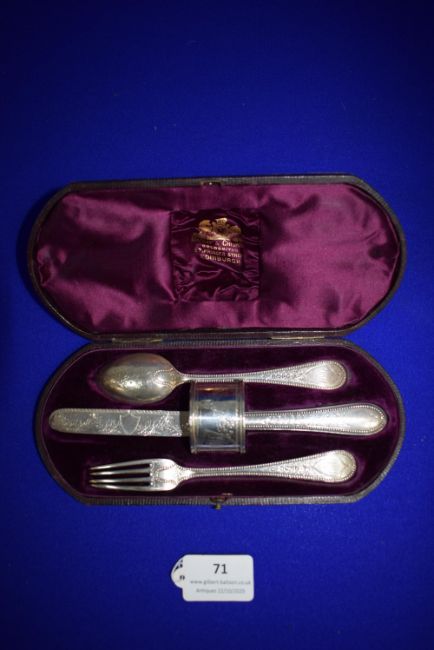 Cased Silver Cutlery Set by Martin Hall & Co. Edinbrugh, in Retailers Case Comprising Knife, Fork, Spoon, and Napkin Ring, Total Weight ~111g