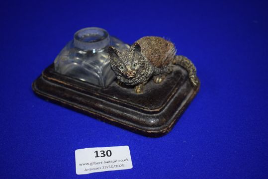 Leather Ink Stand with Cat Shaped Pen Brush (lid missing from ink bottle)