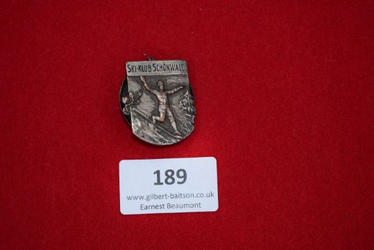 Ski Club Schönwald Badge, a white-metal badge depicting ski jumper in action, inscribed “Ski-Klub Schönwald”.