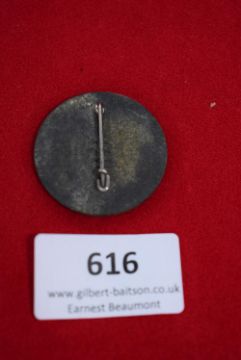 Main 1939 Badge, a circular grey-finish badge with eagle clutching a swastika, dated MAIN 1939, reverse with long vertical pin fitting, surface wear and oxidation present.