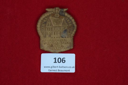 Day Badge, Wolfenbüttel 1936, a pressed card badge, oakleaf wreath design surrounding view of the Wolfenbüttel building, dated 1781–1936, with eagle and swastika motif.