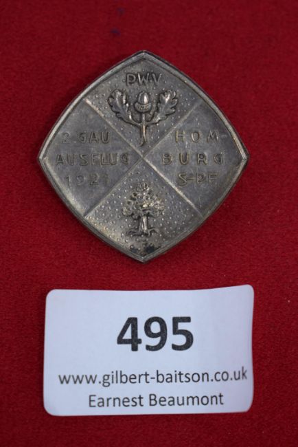PWV Gau-Ausflug Badge, Homburg 1921, a silvered shield-shaped badge quartered with oak leaf, acorn and tree motifs, inscribed “PWV 2. Gau-Ausflug 1921 Homburg S-Pf”, reverse with vertical pin fitting, age toning and wear present.