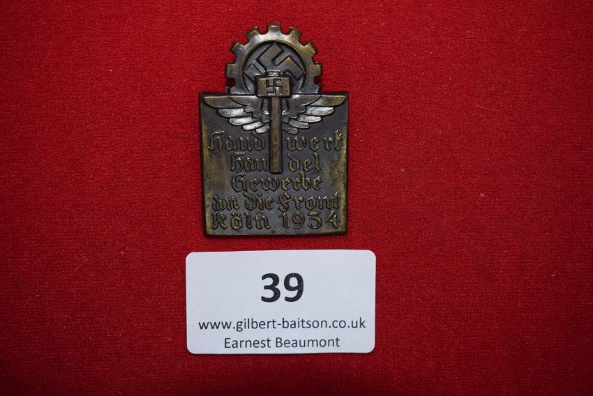 Trade and Commerce Rally Badge, Cologne 1934, a bronze alloy badge surmounted by cogwheel and swastika, inscribed Handwerk Handel Gewerbe an die Front, Köln 1934, with winged hammer motif.