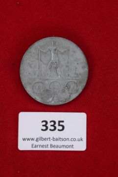 Winterhilfswerk (WHW) Sports Badge, 1936 – A circular tinnie depicting a skier with poles, above interlinked Olympic-style rings inscribed “WHW 1936”, reverse maker marked Eschler u. Sohn, München,