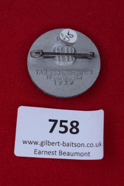Tag des Deutschen Handwerks Badge 1939, a circular grey alloy badge depicting two male figures with eagle above swastika, inscribed Tag des Deutschen Handwerks 1939, reverse with horizontal pin fitting and maker’s emblem, good detail, light patina.