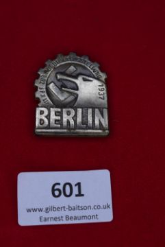 Berlin 1937 Badge, a cogwheel-form badge inscribed MIT KDF ZUR HANDWERKSAUSSTELLUNG 1937 BERLIN, with central horse head and swastika motif, reverse with pin fitting, patina present.