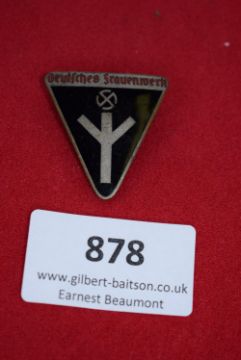 Deutsches Frauenwerk Badge, a triangular enamel badge with black field and silver rune, surmounted by a swastika, inscribed Deutsches Frauenwerk, reverse marked RZM M1/13 with horizontal pin fitting, age toned.