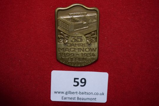 Machnow Factory Jubilee Badge, Berlin 1934, a rectangular gilt pressed badge depicting factory complex, inscribed 35 Jahre Machnow 1899–1934 Berlin, Weinmeisterstr. 13/14.