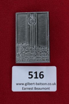 Schützen und Volksfest Badge, Schützenburg, a rectangular grey-finish badge inscribed “Landesführer Schützen u. Volks-Fest Auf der Schützenburg”, with central columns surmounted by eagle, reverse with pin fitting, toned with surface marks.