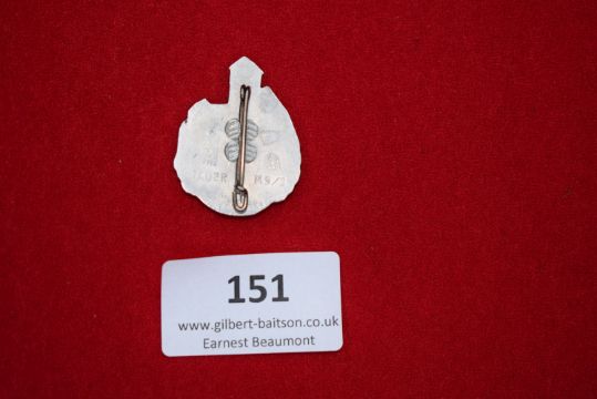 KdF Gau Franken Badge, a silvered badge depicting Nuremberg castle with central cogwheel and swastika, inscribed KdF Gau Franken, pinback marked Lauer, Nuremberg.