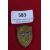 Local Commemorative Badge with Helmet & Aircraft, a shield-shaped brass-finish badge, obverse featuring a German soldier’s helmet above a flying aircraft and figure, surrounded by foliate sprays and inscriptions, reverse with vertical pin fitting and traces of solder, surface wear consistent with age.