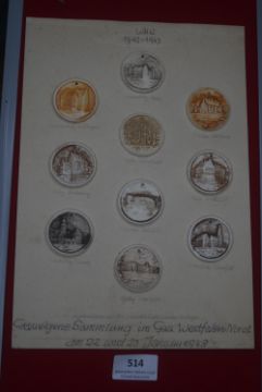 WHW 1942–1943 Gau Collection (Westfalen-Nord) – Nine circular ceramic/fired clay badges with detailed town and castle scenes, labelled with place names, dated 22–23 January 1943.
