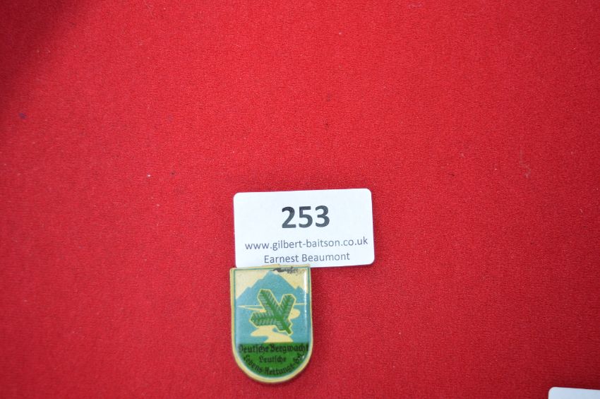 Enamelled Commemorative Tinnie Badge “Deutsche Bergwacht” – A shield-shaped pressed tin badge with enamelled decoration, depicting stylised green alpine fir branch against a mountain backdrop, inscribed Deutsche Bergwacht – Deutsche Lebens-Rettungs-Ges. Retains original pin to reverse.