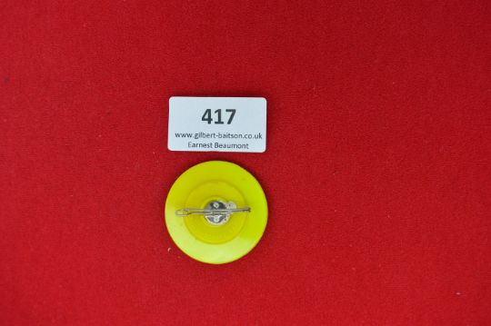 Plastic Fundraising Badge with Religious Medallic Insert – A circular yellow plastic badge with pin-back fitting, inset with a small silvery relief of the Madonna and Child. The outer ring inscribed with religious text in German.