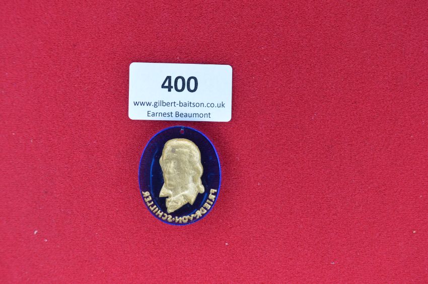 Glass Portrait Plaque of Friedrich von Schiller – An oval-shaped translucent blue glass plaque, moulded with a left-facing portrait bust of the German poet Friedrich von Schiller. His name inscribed below. Drilled at the top for suspension.
