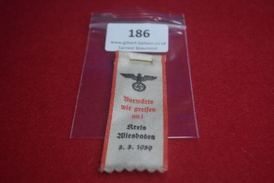 Nazi-era political rally ribbon badge, white cloth printed with eagle/swastika and slogan “Vorwärts wir greifen an!” (“Forward, we attack!”), marked “Kreis Wiesbaden, 3.3.1939.” With pin-back fitting.