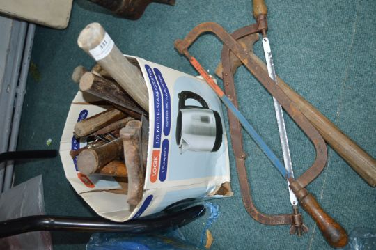 A mixed selection of vintage hand tools including saws, wooden mallet handles, and workshop accessories. Suitable for restoration or display.