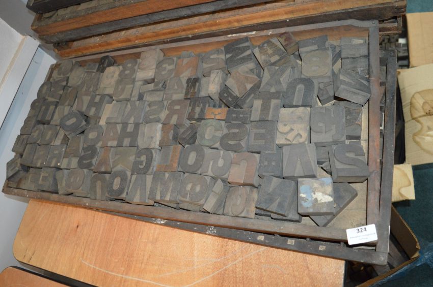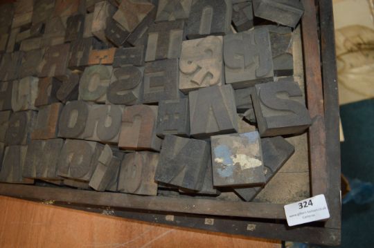 A well-stocked printer’s case of mixed wood letterpress type, comprising large uppercase letters and numerals in varying styles and sizes. Excellent character and colour, ideal for decorative or functional presswork.