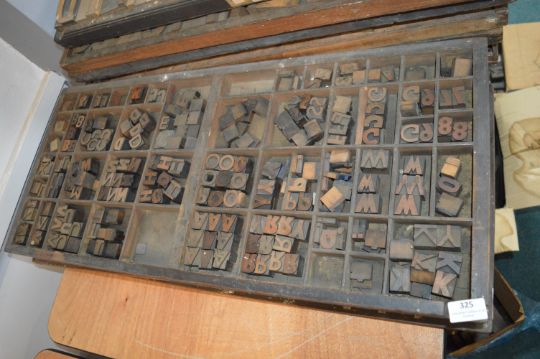 Wooden printer’s case containing medium-sized wood type, assorted fonts including serif and bold styles. Good range of letters and numerals, all retaining original patina.