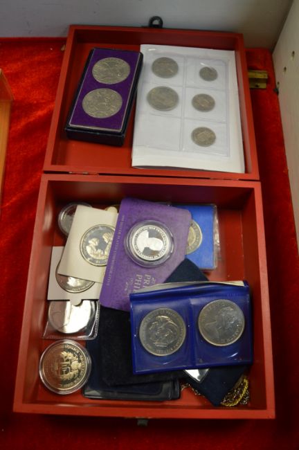 Union Jack Wooden Box Containing Royal Commemorative Coinage, etc.