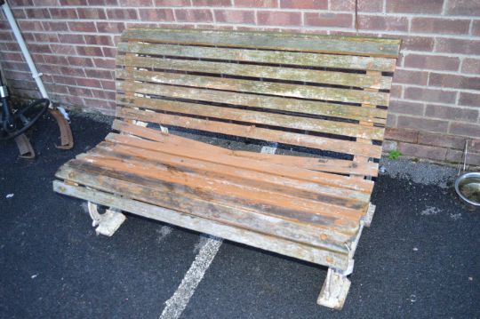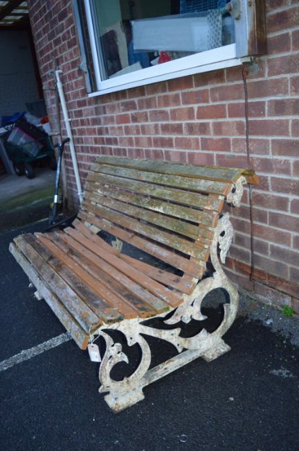 Garden Bench with Decorative Cast Iron Ends (some faults to wooden slats)