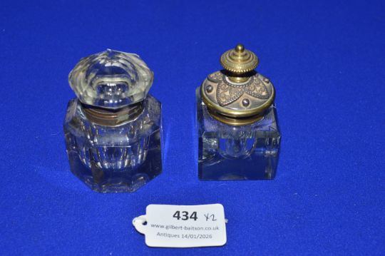 Pair of Victorian Glass Inkwells with Brass Caps & Collars