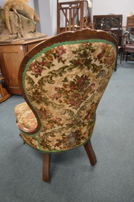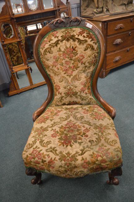 Victorian Mahogany Nursing Chair with Carved Detail and Floral Tapestry Upholstery
