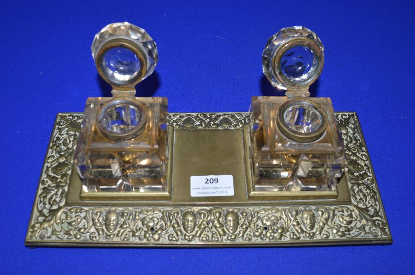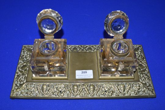 Brass Ink Stand with 2x Cut Glass Inkwells