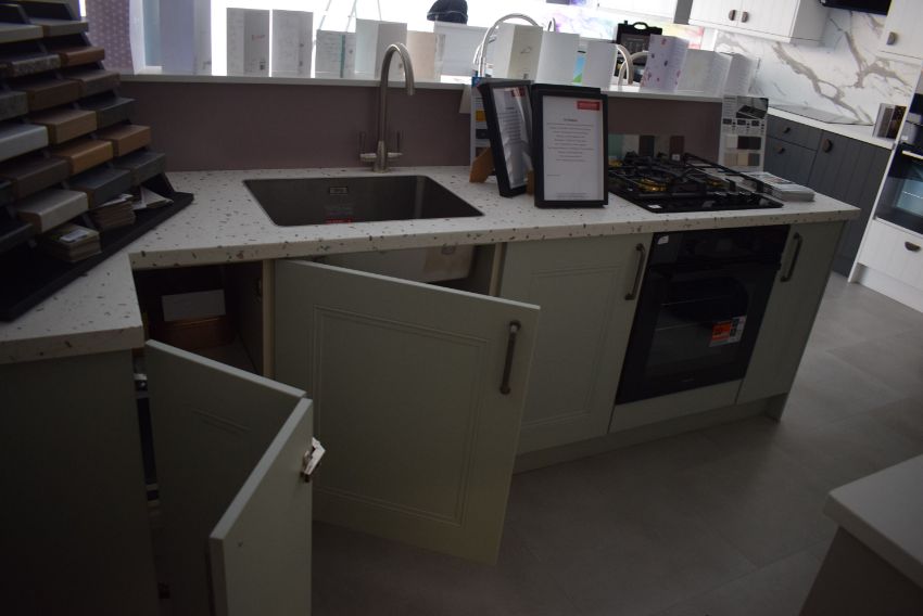 *L-Shape Kitchen Display 94x296cm in Pistachio Green with Simulated Granite Worktop, Including Franke Stainless Steel Sink, Franke Brushed Stainless Steel Swanneck Tap