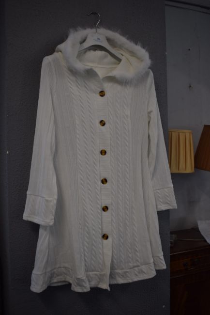 Long White Cardigan Style Coat with Fur Trimmed Hood Size: XL