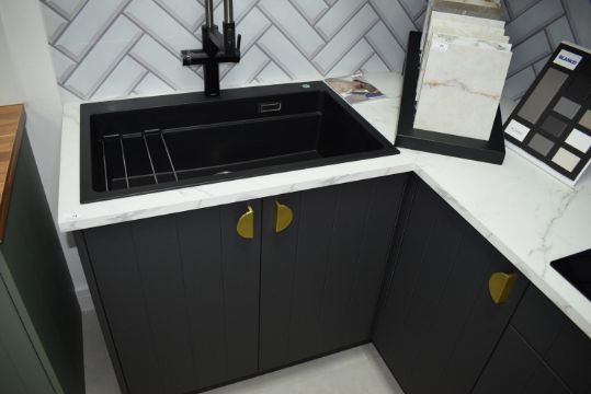 *Grey L-Shape Display Kitchen 265x145cm with White Wall Units, Grey Base Units, Simulated Marble Effect Worktop, and Gold Handles. Including Bianco Contemporary Single Bowl Sink, Swanneck Tap with Flexible Rinse, Integral Wastebins, and Cutlery Tray