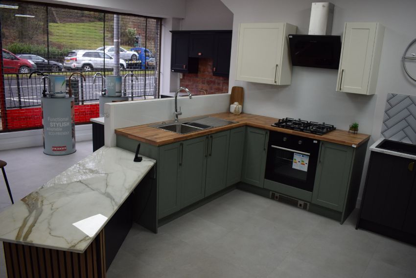 *Sage Green L-Shape Kitchen Display 189x204cm with Butcher Block Style Worktop, and Angled Breakfast Bar Unit. Including Franke Stainless Steel Bowl & a Half Sink, Swanneck Monoblock Tap, Plinth Heater, and Integral Storage