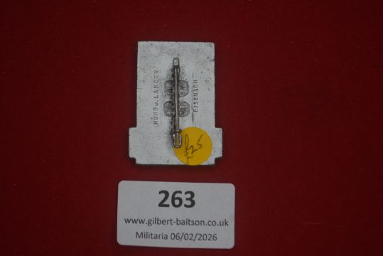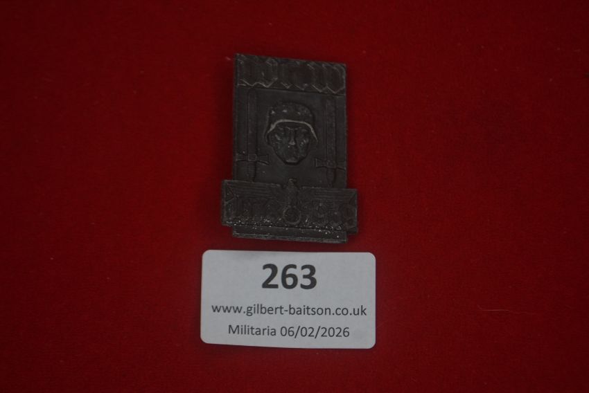 German Third Reich period tinnie, cast in darkened metal, featuring a soldier’s head within a stylised architectural surround, with decorative panel below bearing eagle and swastika motif. Reverse with pin fitting, maker marked Würth, Langer, Eisenach
