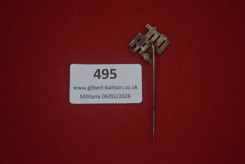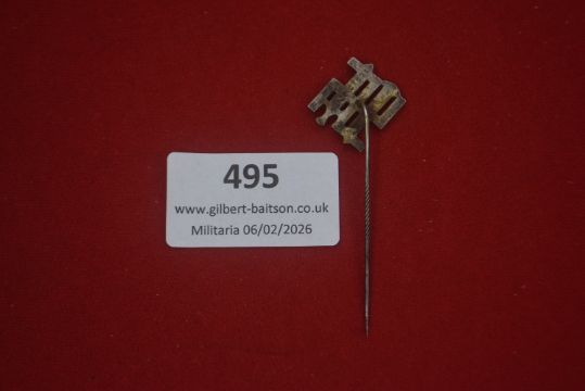 German Third Reich stick pin badge, metal example with crossed tool and agricultural motifs, complete with long twisted pin fitting. Reverse showing cut-out construction. Worn condition with surface oxidation.