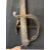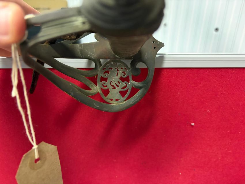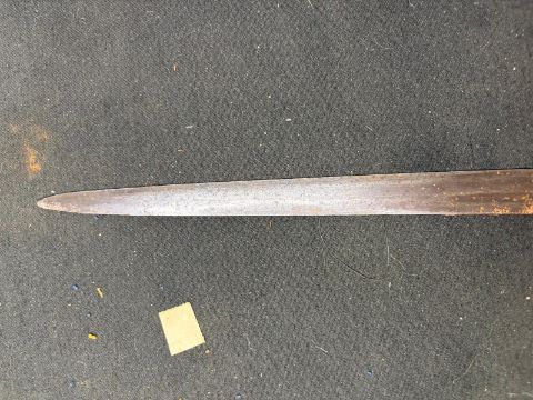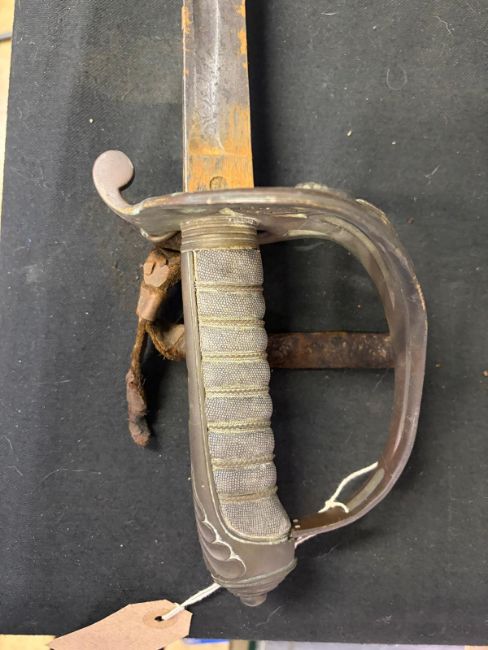 British cavalry sword with single-edged blade, plain blade with central fuller, steel hilt with triple-bar guard and ribbed grip, complete with leather-covered steel scabbard. Blade showing corrosion and surface wear,