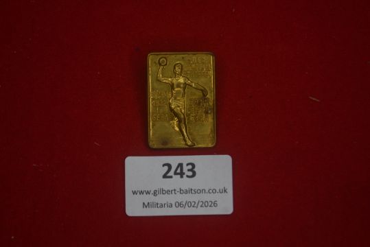 German sports or athletics badge, rectangular form depicting a discus thrower, dated 1932 with references to Leipzig, Gera and Zeitz. Gilt finish with rear pin fitting. Likely inter-war period,