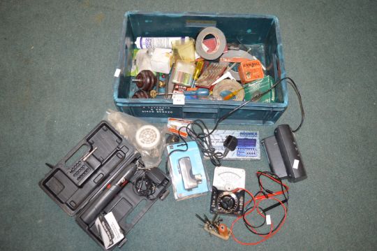 Box of Assorted Tools, Multimeter, Surge Protector, Drill Bits, Electric Screwdriver, etc.