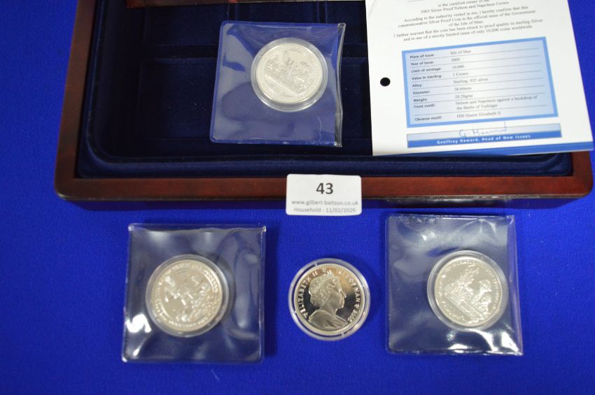 Set of Four Lord Nelson 2005 Silver Proof Ilse of Man 1oz Crowns with Presentation Case, plus Trafalgar CU £5 Coin