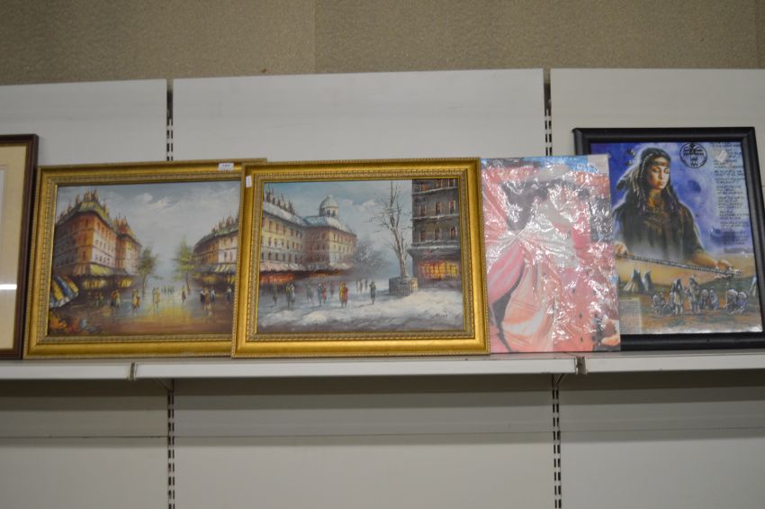 2x Gilt Framed Oils on Canvases of Parisian Street Scenes Signed Pierri, and 2x Prints