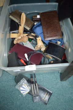 Box of Assorted Items Including Hip Flasks, Darts, Wooden Bird Ornaments, Wallets, etc.