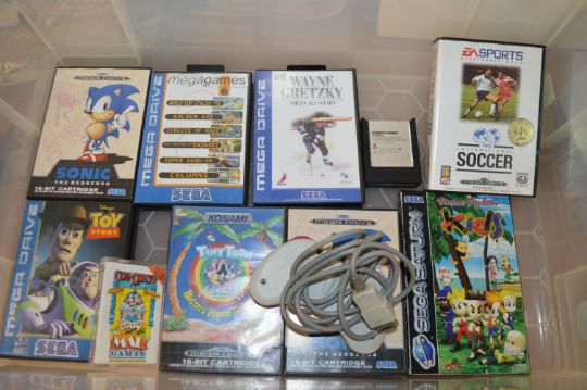 Selection of Vintage Sega Games Including Sonic, EA Sports Soccer, Tiny Toon, Donkey Kong, etc. plus Controller
