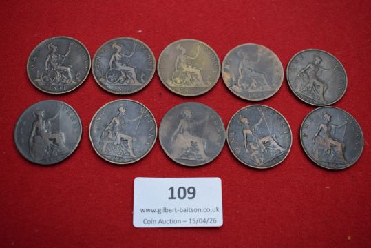 Ten Victorian bronze pennies dated 1891–1900 (various). Mixed condition