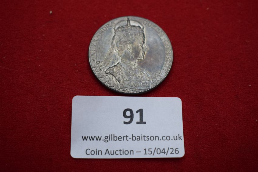 Coronation silver medal, Edward VII and Queen Alexandra, 1902. Conjoined crowned busts with legend ‘Edward VII Crowned 9 August 1902’; rev. crowned bust of Queen Alexandra with legend ‘Alexandra Queen Consort’.