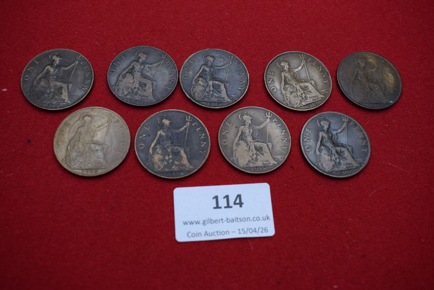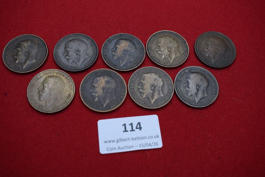 Group of George V pennies dated 1912–1919 (various). Mixed condition.